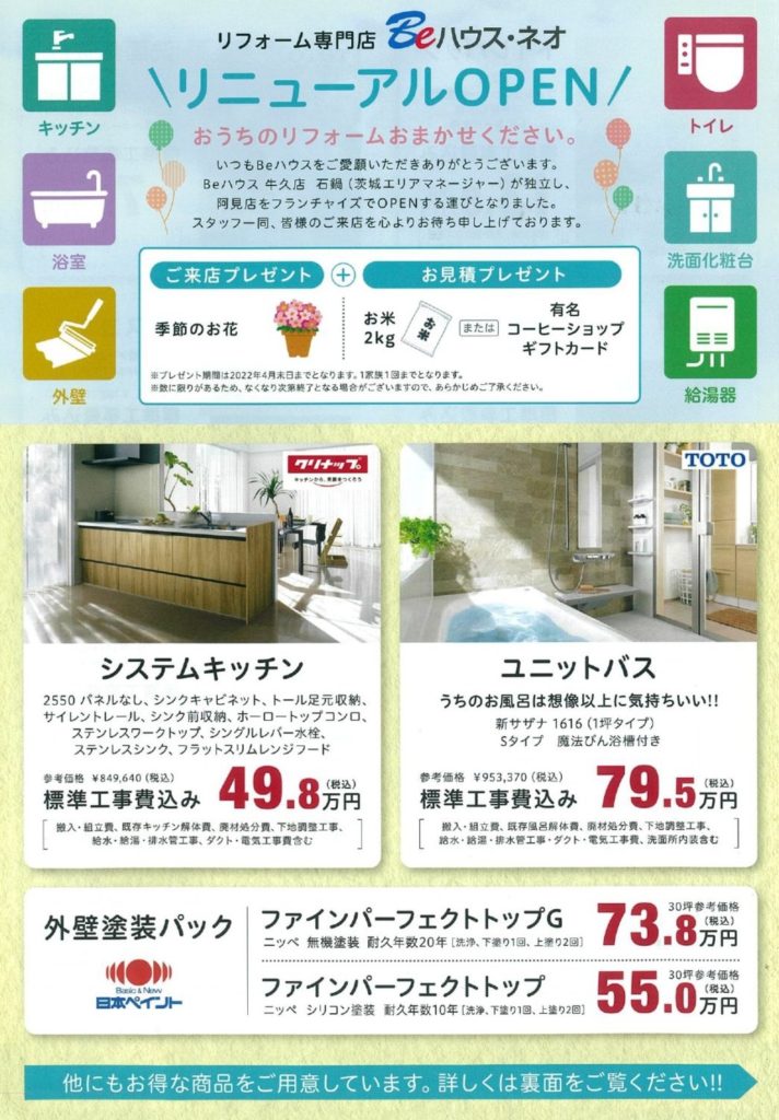 チラシ内容:リニューアルオープン・リフォーム商品ご紹介・プレゼントキャンペーン