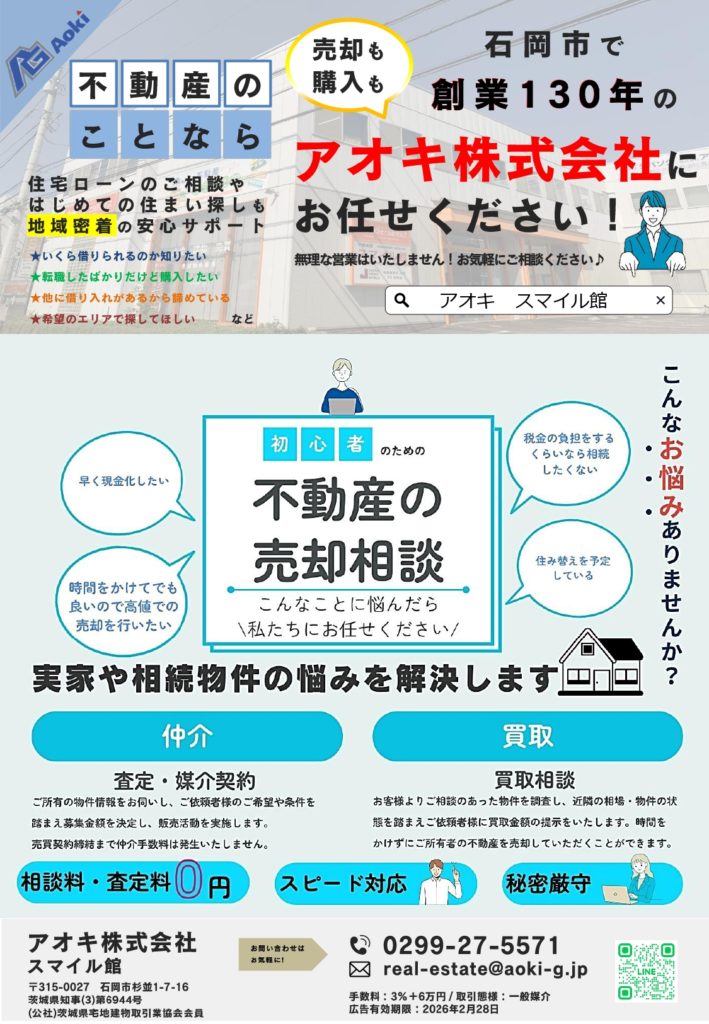 こんにちは、茨城みらい新聞折込です。 茨城県石岡市で不動産会社様よりポスティングのご依頼をいただきました! チラシ内容のご紹介です! 〇お客様情報(敬称略) アオキ株式会社 スマイル館 住所:茨城県石岡市杉並1-7- …